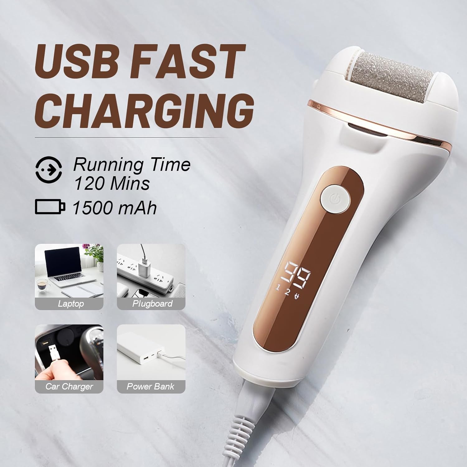 - 【Rechargeable & Digital Display】This efficient foot care tool is equipped with a 1500mAh high-capacity lithium battery, which takes approximately 2-3 hours to fully charge and provides up to 120 minutes of operating time (enough for 4 weeks of weekly pedicures). The digital display shows the remaining battery power and alerts you when it is time to recharge. It also has a built-in light: turns on with the device to illuminate callus areas, ensuring you don’t miss hidden dry skin.