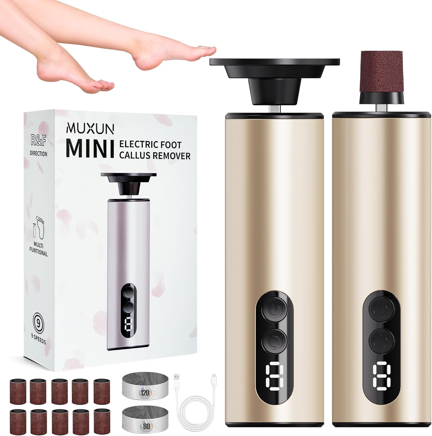 Electric Foot Callus Remover,2 in1 Rechargeable Callus Remover for Feet,9-Speed Wireless Electric Foot File Nail Grinder,Foot Scrubber Pedicure Tools for Dead Skin Dry Cracked Feet (Gold MINI)